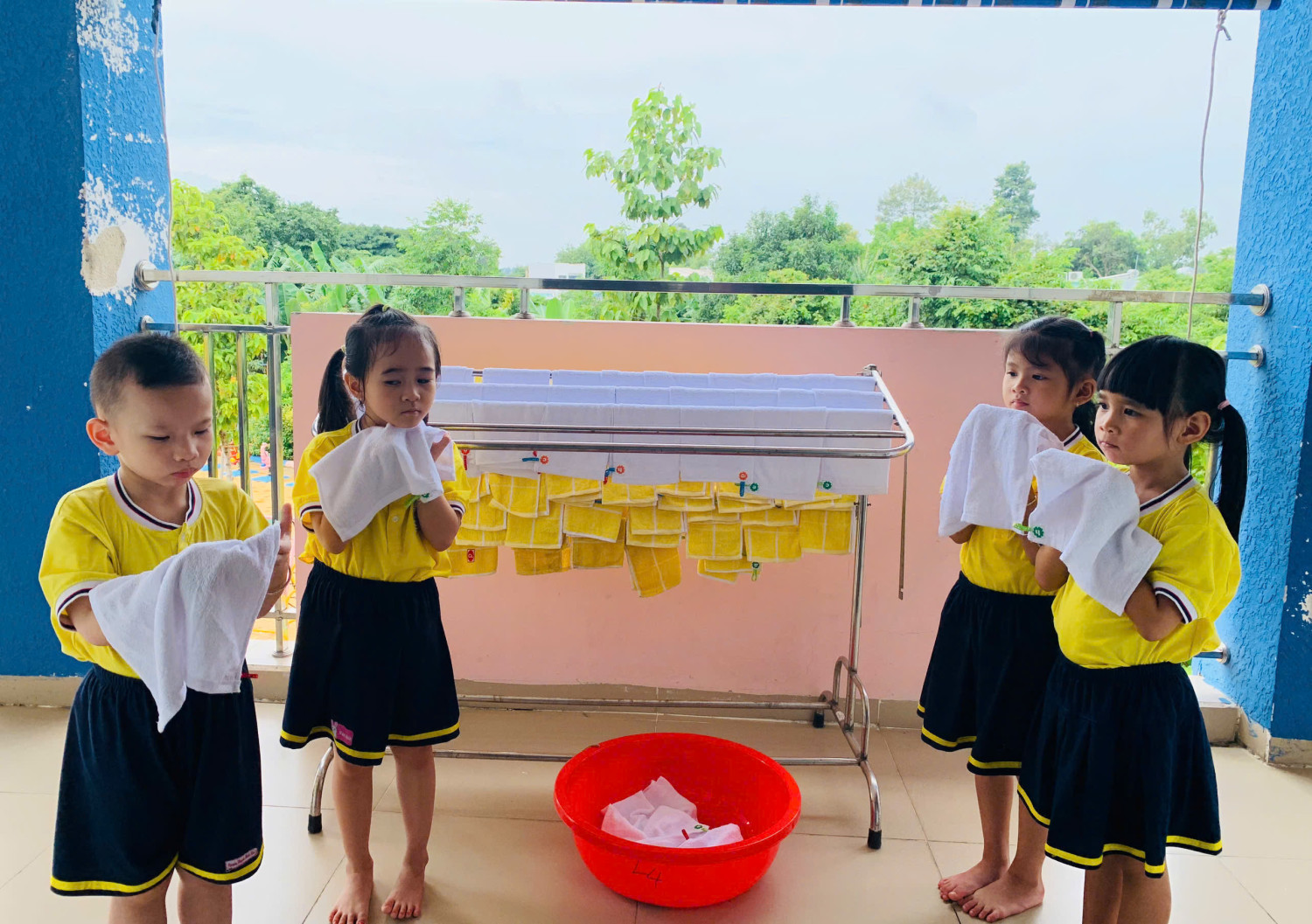 Nhờ sự hướng dẫn nhẹ nhàng của cô giáo, các bé dần hình thành thói quen tự giác, biết chăm sóc bản thân và góp phần giữ cho lớp học luôn sạch sẽ, ngăn nắp.