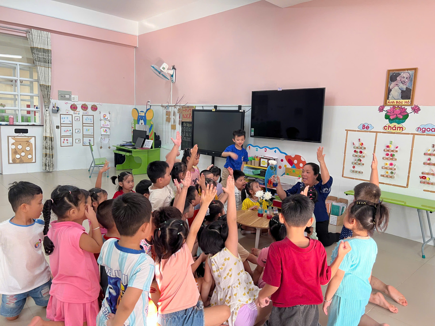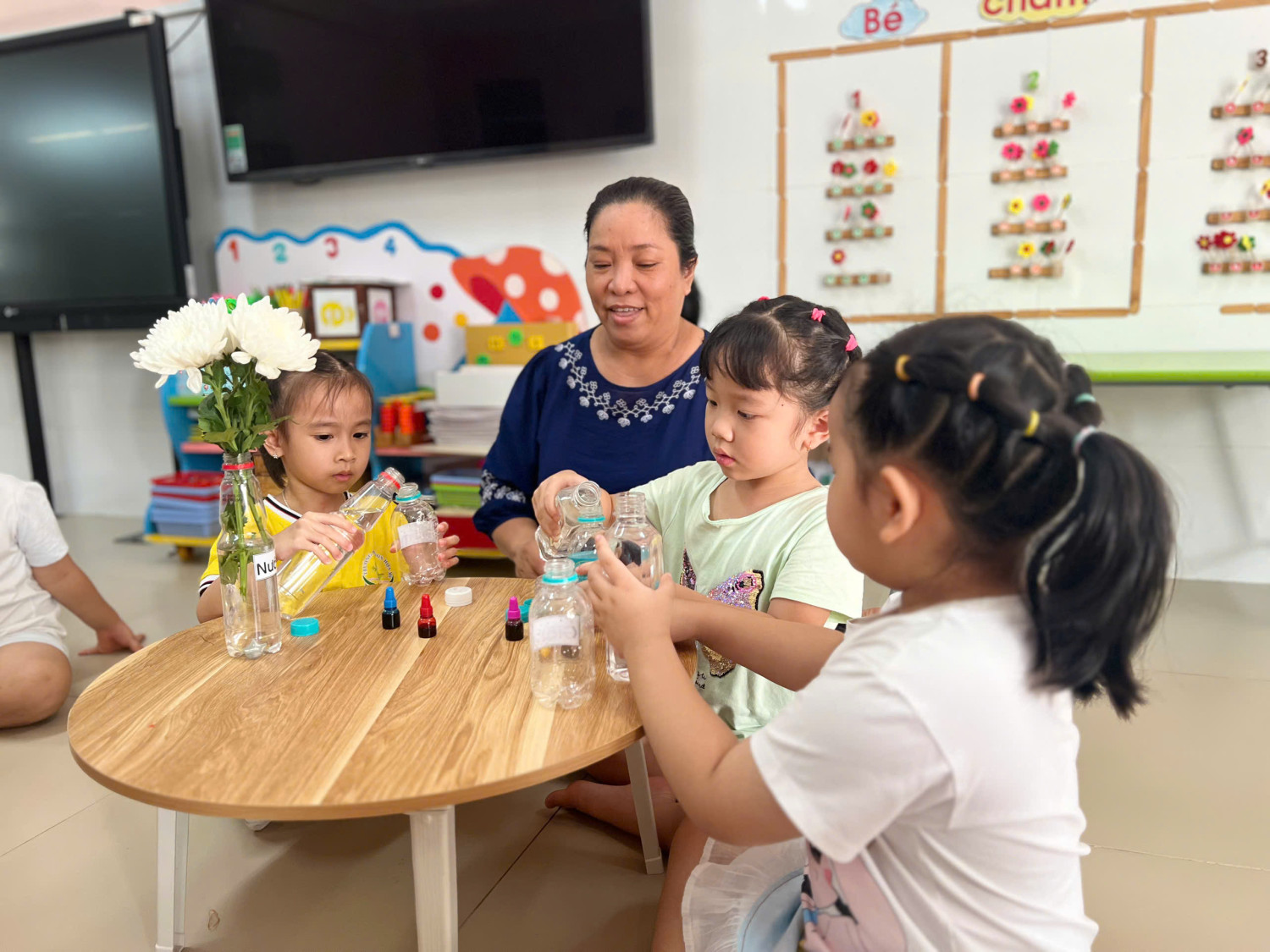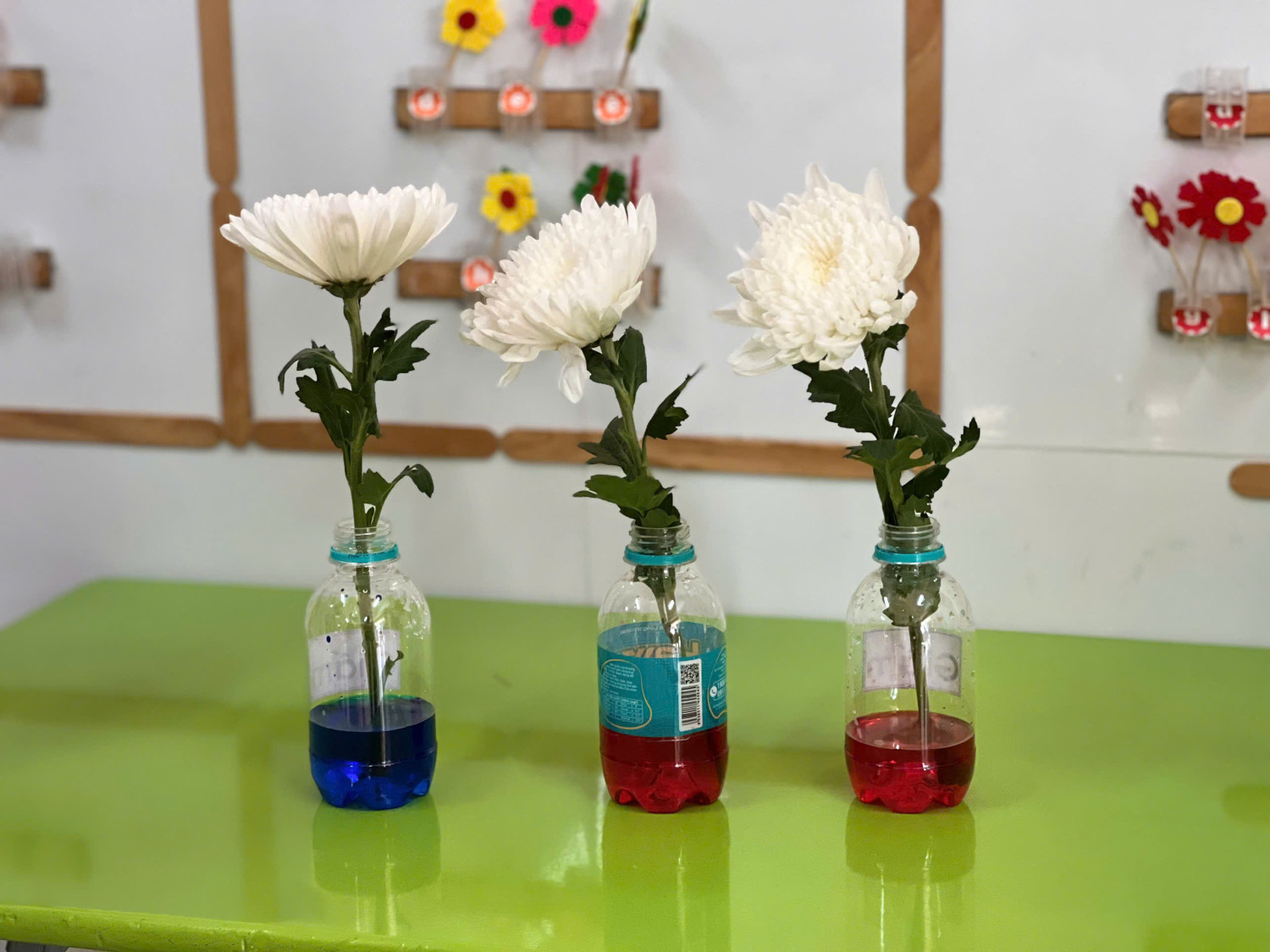 Các bé lớp Lá 3 đã có một buổi trải nghiệm khoa học đầy thú vị với thử nghiệm “Sự đổi màu của hoa cúc trắng”. Từ những bông hoa trắng ban đầu, qua việc cắm vào các cốc nước màu khác nhau, các bé đã bất ngờ khi thấy cánh hoa dần chuyển sang màu sắc tương ứng.